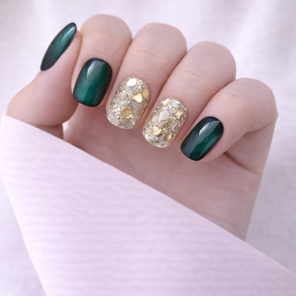 Ga voor een elegante en luxe uitstraling met de Emerald Gold Luxe Press-On Nails. Deze verfijnde nagelset combineert diepe smaragdgroene tinten met glinsterende gouden accenten en subtiele shimmer voor een rijke en stijlvolle look.