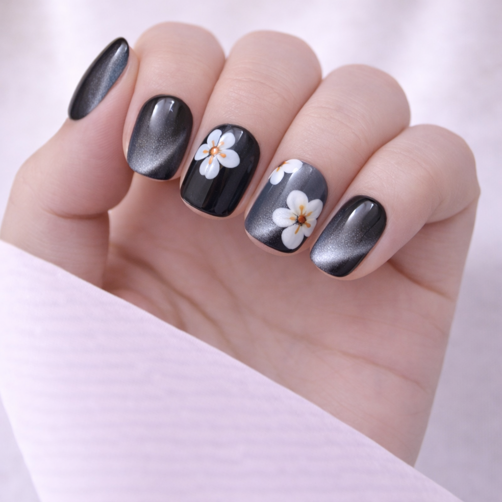 Deze set combineert diepe zwarte tinten met een subtiele chrome glans en verfijnde bloemdetails. Het contrast tussen donker en zacht maakt deze nails perfect voor een stijlvolle, moderne uitstraling.