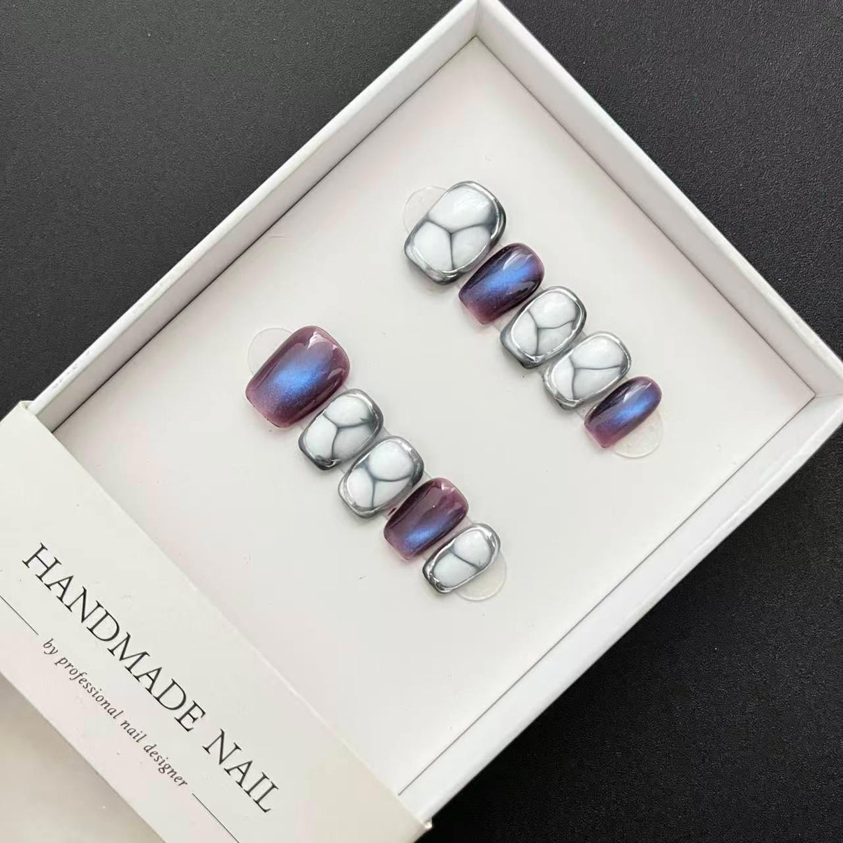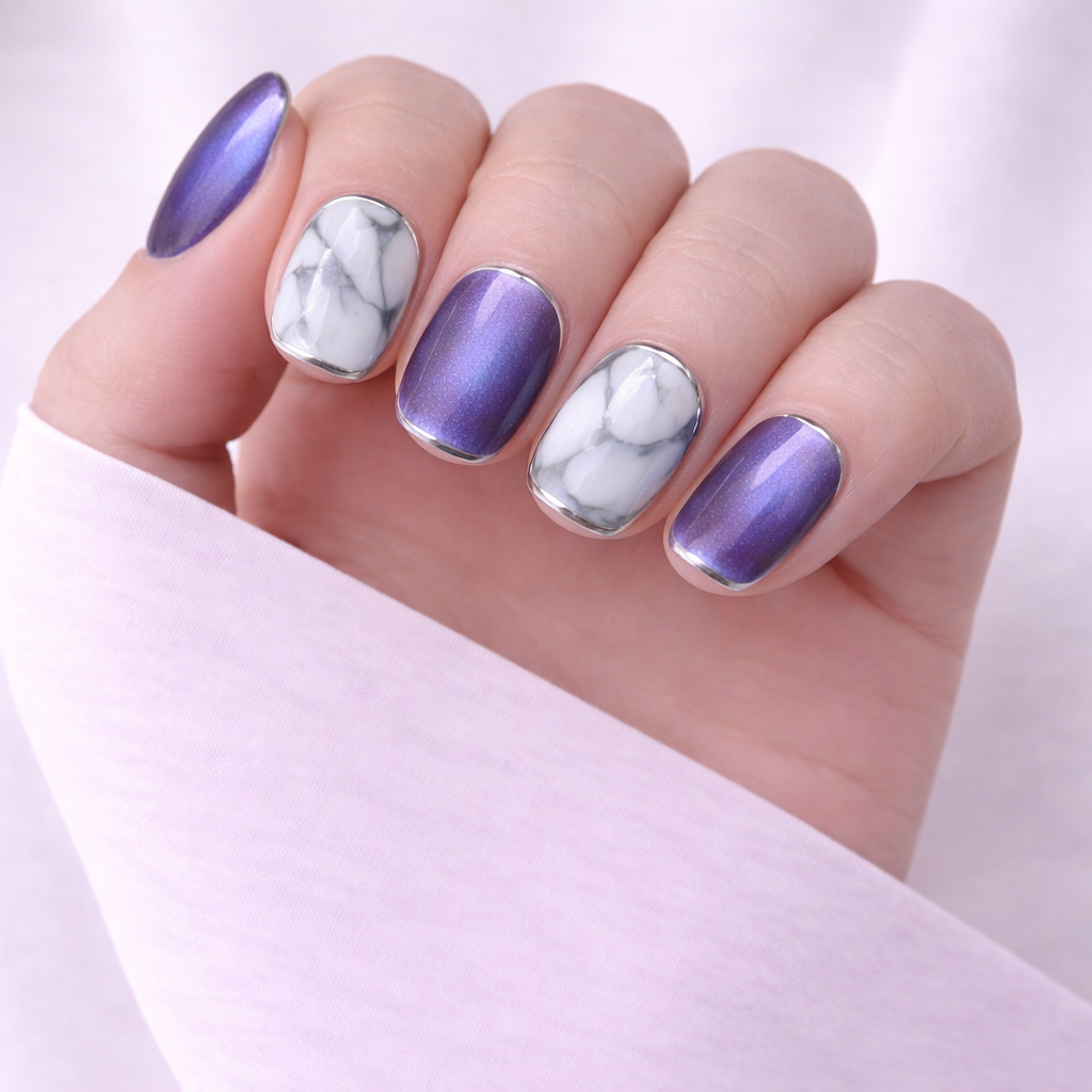 Ga voor een moderne en luxe uitstraling met de Nebula Glow Press-On Nails. Deze unieke nagelset combineert een metallic zilveren marble effect met een subtiele paarse aurora glans voor een futuristische en stijlvolle look.